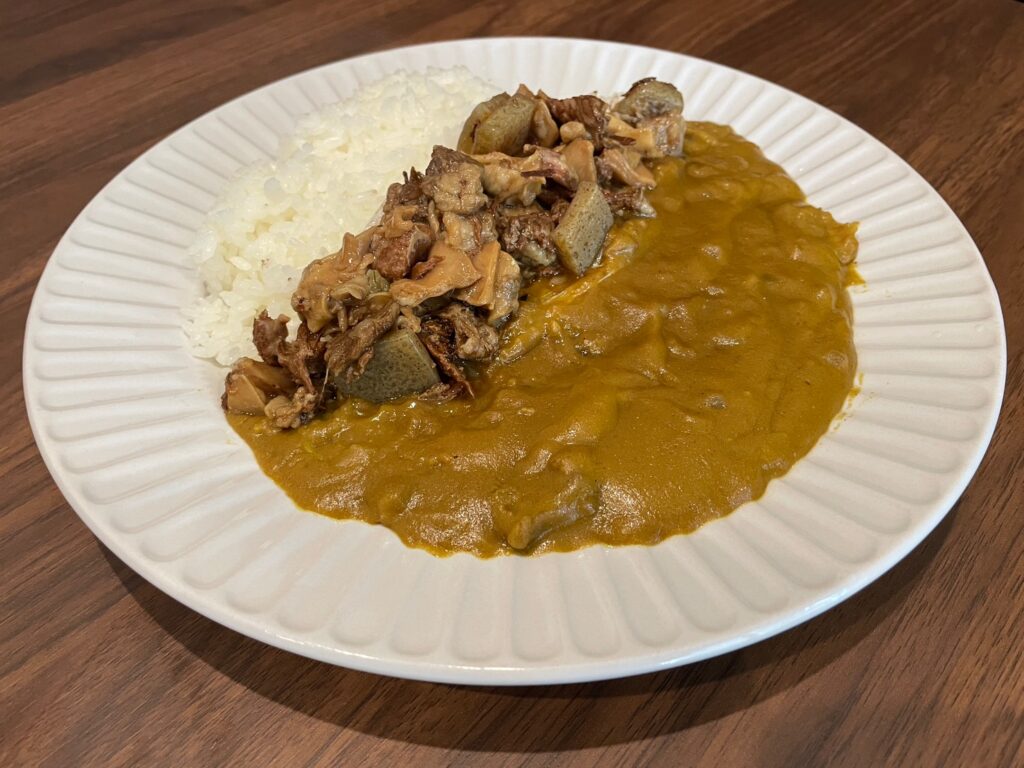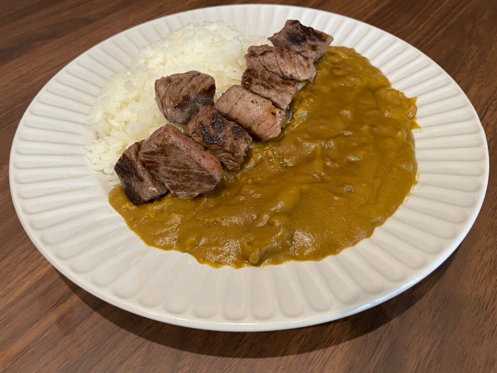 鉄板焼きで焼きたてのお肉やお野菜をトッピングに添えてのカレーです。
